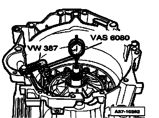 ^ Attach Dial gauge VAS 6080 with Dial gauge holder VW 387 to transmission flange.