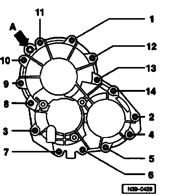 ^ Tighten bolts on front final drive cover in 2 stages in the tightening sequence shown as follows: