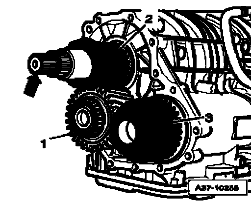 ^ Insert pinion gear - 3 - into transmission housing together with intermediate pinion - 1 -, as marked when removed, pull back drive pinion - 2 - from input shaft approximately 20 mm to do so.
