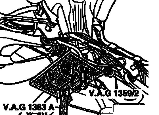 ^ Place Engine/transmission jack V.A.G 1383 A with universal transmission support V.A.G 1359/2 under final drive and secure final drive.