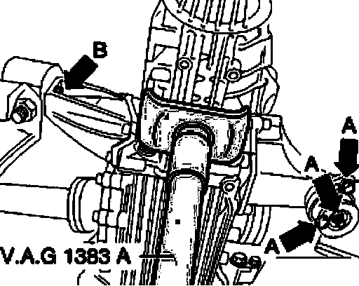 ^ Left transmission support must be removed from bonded rubber bushing - arrow B -.