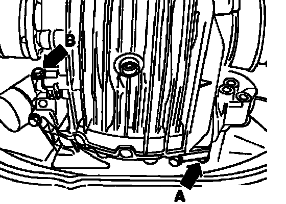 ^ Disconnect connector for back-up lights - arrow B -. Disconnect all other electrical connections and ground wires from transmission and from engine/transmission mounting bolts.