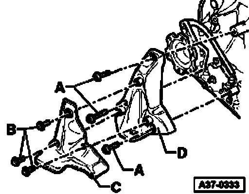 ^ Lift transmission slightly using engine-/transmission jack and remove transmission mounts - D - or - H -.