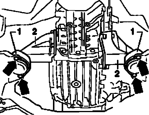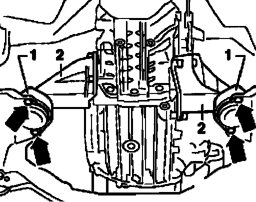 ^ Remove bolts - 1 - and - 2 - at rear of subframe on both sides of vehicle.