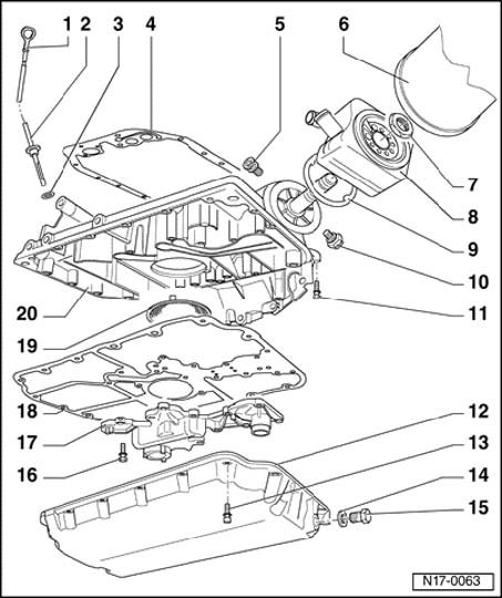 Oil pan, oil filter and oil cooler, assembly overview