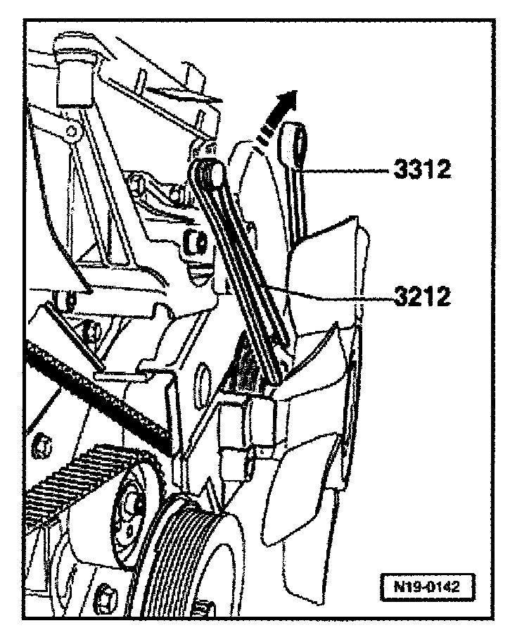 - Counter-hold viscous coupling pulley with spanner 3212 and remove viscous coupling using wrench 3312 (left-hand thread, -arrow-).