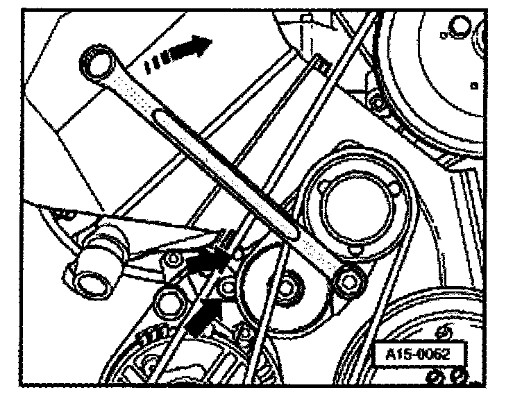 - Turn tensioning roller clockwise -arrow- with wrench on securing bolt