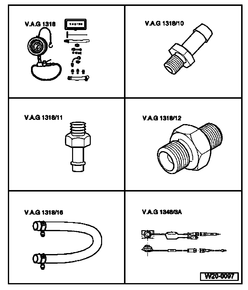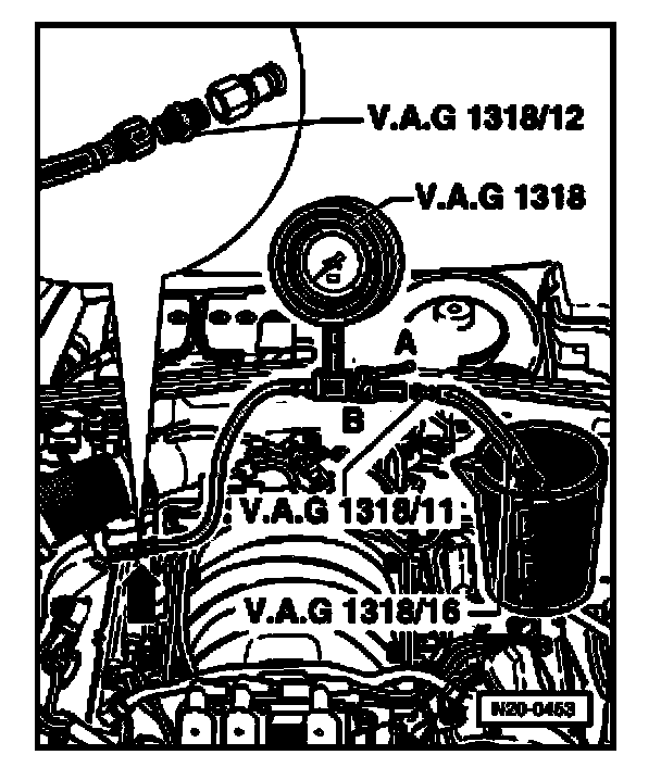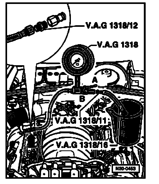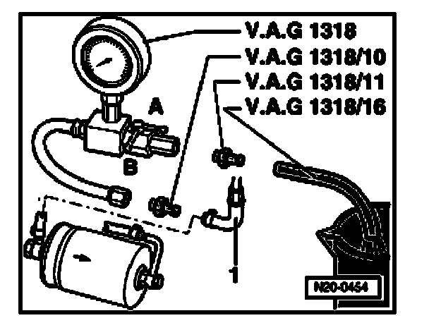 - Connect pressure gauge V.A.G 1318 with adapter V.A.G 1318/10 to hose.