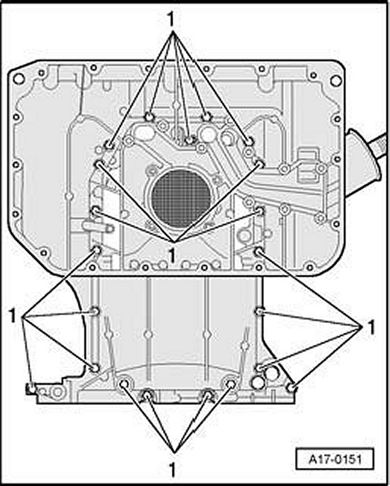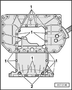 Set upper part of oil pan in place and fasten bolts - 1 - alternating diagonally to 5 Nm.