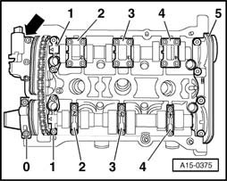 Both markings on camshafts must be aligned with both arrows on bearing caps - arrows -.