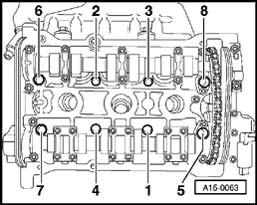 Install bearing caps - 0 -, - 3 - and - 5 - and tighten to 10 Nm (pay attention to alignment pins).
