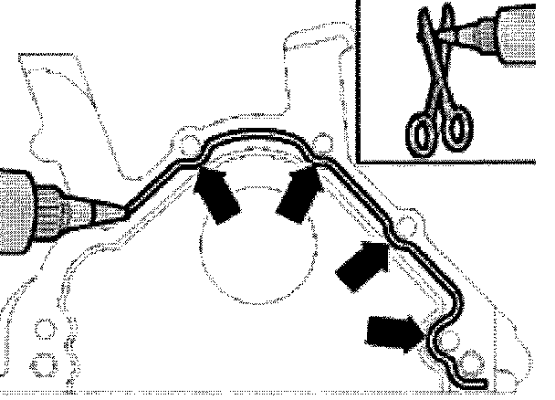 - Apply silicon sealant to clean sealing surfaces of sealing flange as shown. Sealant bead must: