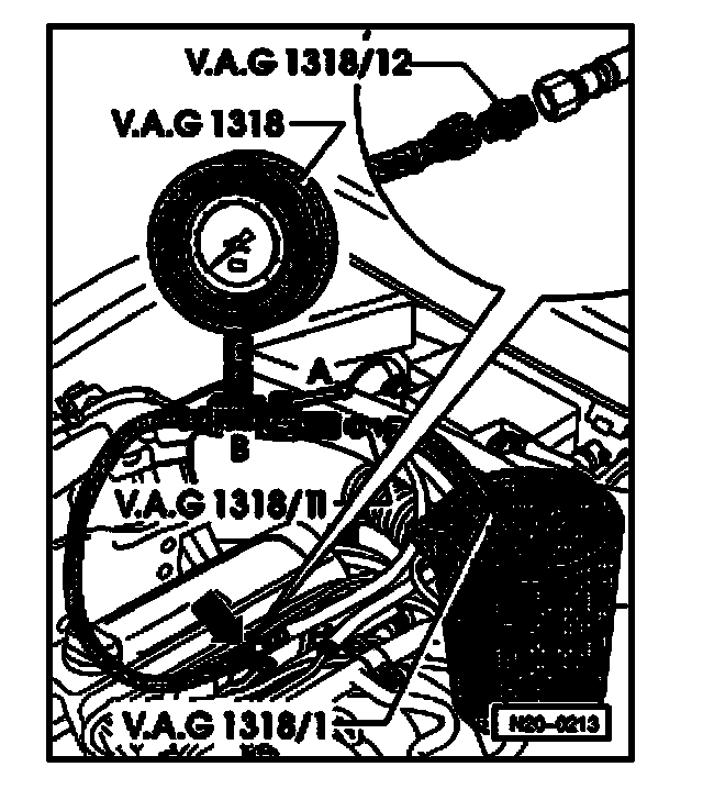 NOTE: This test also checks the connections of the fuel supply line from fuel delivery unit to connection point of Pressure Gauge V.A.G 1318 for proper seal.