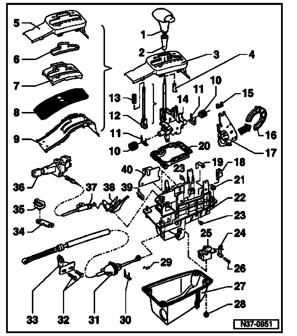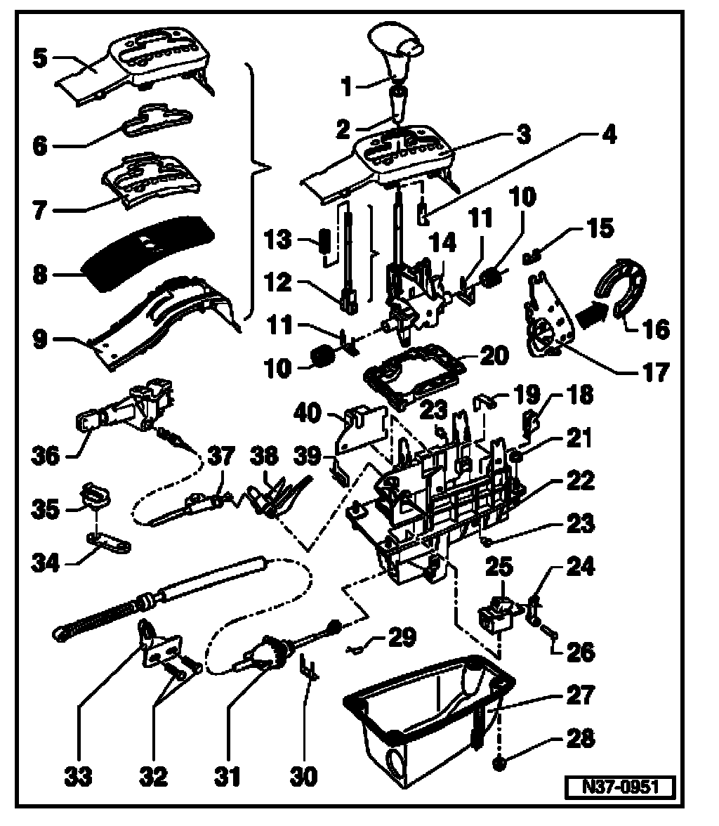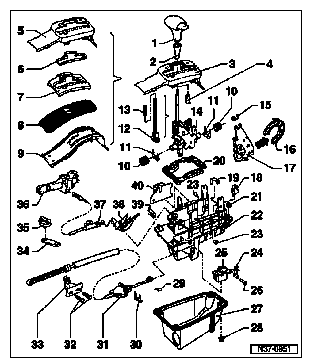 - Check locking function of locking cable lever -38-. It must engage in detent -16- and block selector lever with selector lever -14- in position "P".