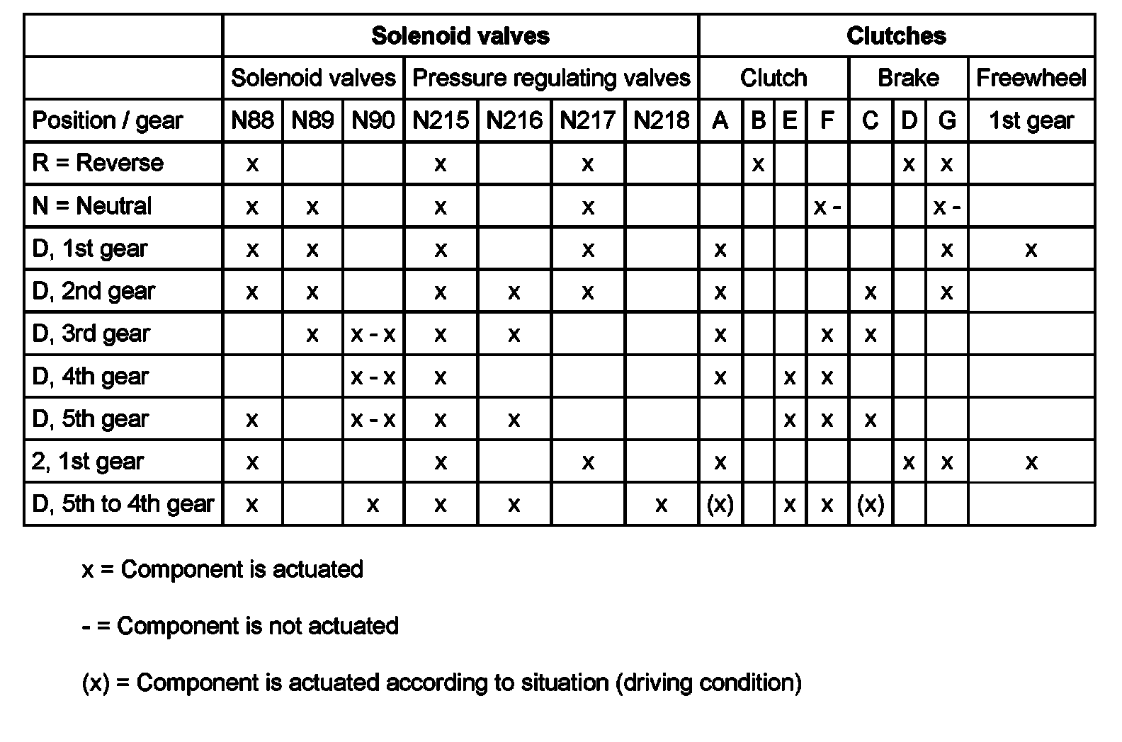 ^ If complaints are made about poor acceleration and speed performance or about the drive in general, the following table can be used to determine which selector elements operate in which gears. Using a process of elimination, faulty selector elements can be therefore be identified.