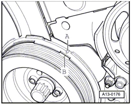 - Set the crankshaft to Top Dead Center (TDC). The marking on the toothed belt guard - A - must be aligned with the notch on the pulley - B -.