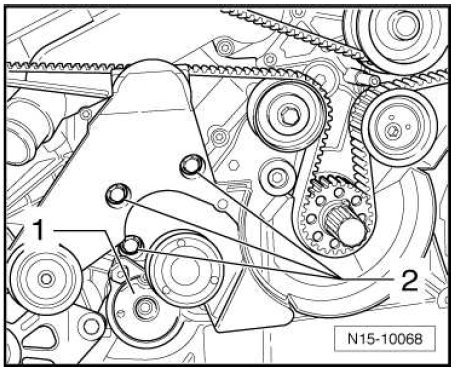 - Remove the bolts - 2 - for the toothed belt tensioner element cover.