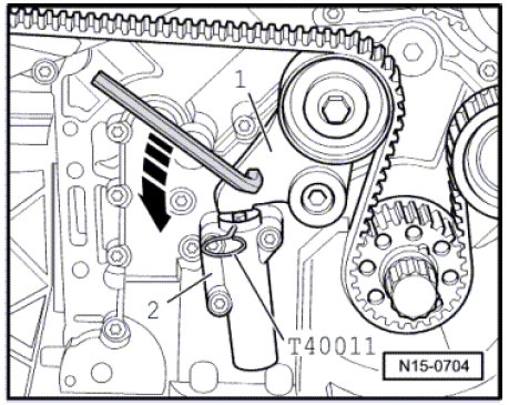 - When the tensioner lever has compressed the piston in the tensioner element - 2 -, pull out the (T40011).