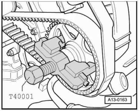 - When the tensioner lever pushes the tensioner element - 2 - together so that the holes in the housing and piston align, secure the tensioner element using the (T40011).