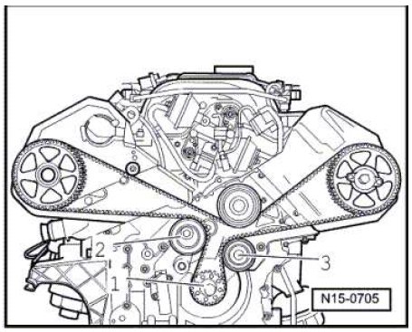- Install the toothed belt onto the crankshaft toothed belt sprocket - 1 - first, then onto the tensioner roller - 2 - and then onto the eccentric roller - 3 -. Then, install it onto the camshaft gears and the coolant pump pulley as shown in the illustration.