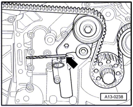 - Install a 5 mm drill bit - arrow - between the tensioner lever and the piston of the tensioner element.