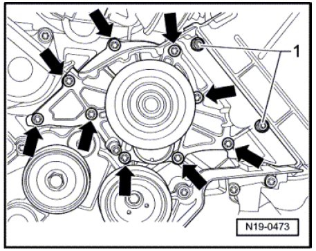 - Remove the coolant pump bolts - arrows -.