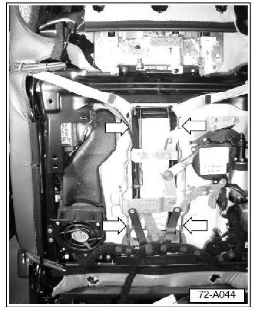 - Remove front seat backrest cover. See Repair Manual, Group 72, Body Interior, Seat backrest cover, removing and installing.
