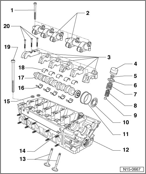 • Observe "Notes", refer to --> [ Cylinder heads with cracks between the valve seats can continue to be used without reducing service life, as long as the cracks have a max.width of 0.5 mm. ] Cylinder Head Assembly Overview.