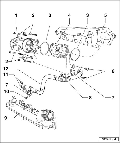 • Exhaust Gas Recirculation (EGR) is controlled by the Engine Control Module (ECM) 1 (J623) and ECM 2 (J624) via EGR vacuum regulator solenoid valve (N18) (electro-pneumatic) and EGR valve 2 (N213) (electro-pneumatic) to the mechanical EGR valves.