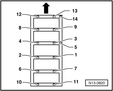 - Tighten the bearing bracket bolts - 1 through 13 - in three passes in the sequence shown as follows (- arrow - points in driving direction).