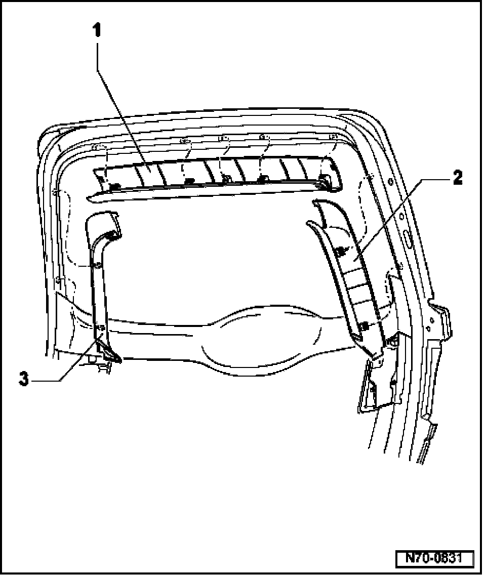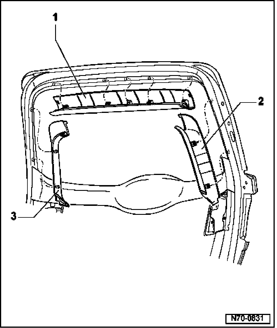 - Pull upper window frame trim -1 - in direction opposite of travel out of mountings in tailgate.