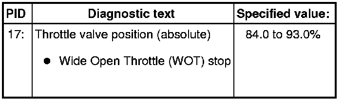 - Check specified value of throttle valve position (absolute) at Wide Open Throttle (WOT) stop: