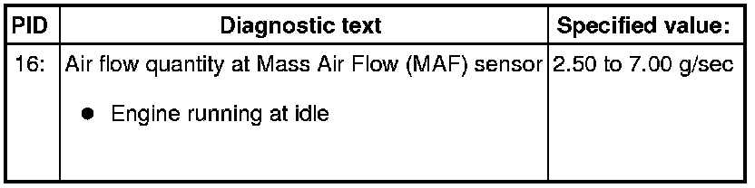 - Check specified value of air flow quantity at Mass Air Flow (MAF) Sensor at idle: