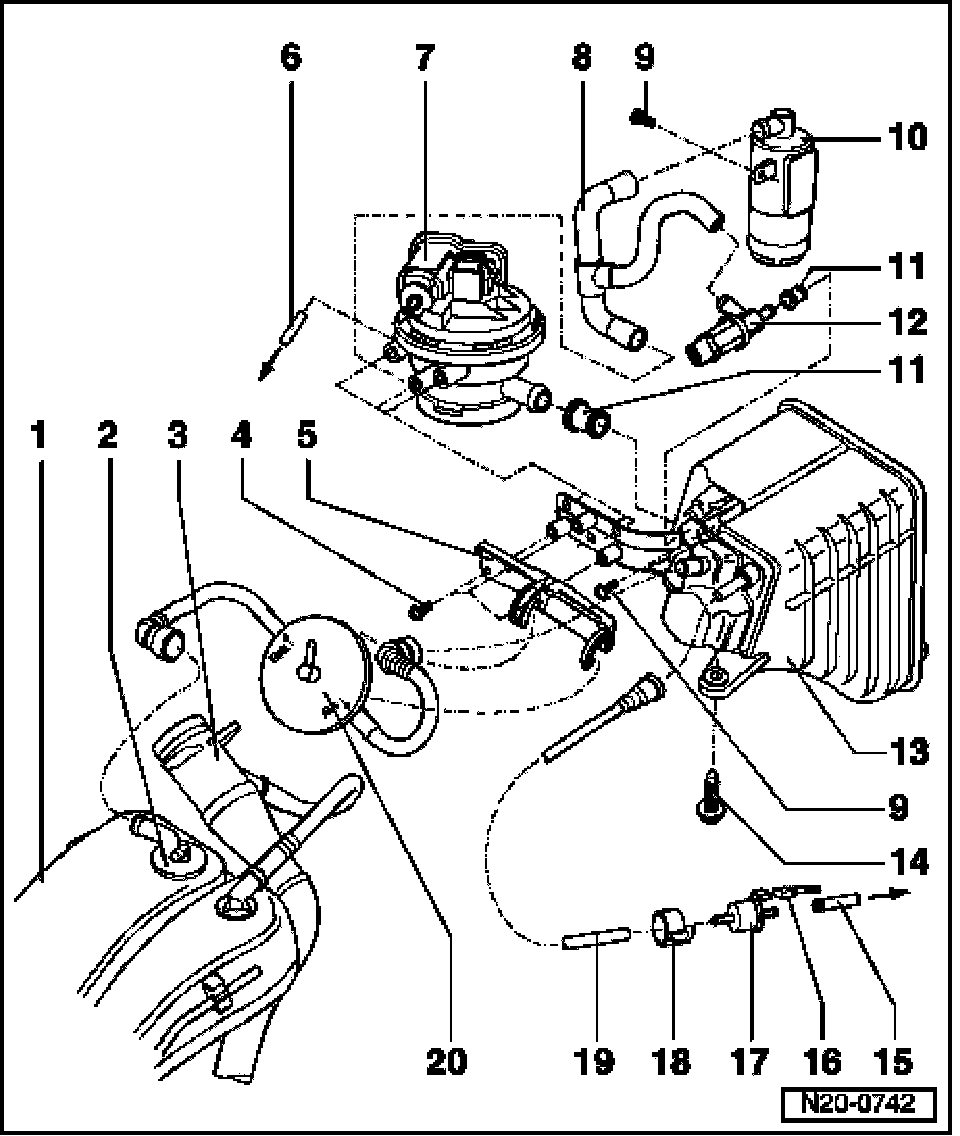 - Between air filter, Leak detection pump (LDP) -V144-, and Evaporative Emission (EVAP) Canister Purge Solenoid Valve -N115-