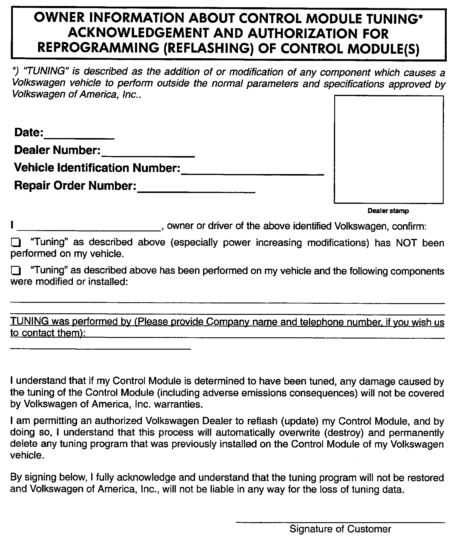 ^ Your Dealership should place the vehicle owner on notice in writing, that their ECM or TCM was found to have been tuned, and that any damage caused by the tuning of the ECM or TCM (including any adverse emissions consequences) will not be covered by Volkswagen of America, Inc. warranties.