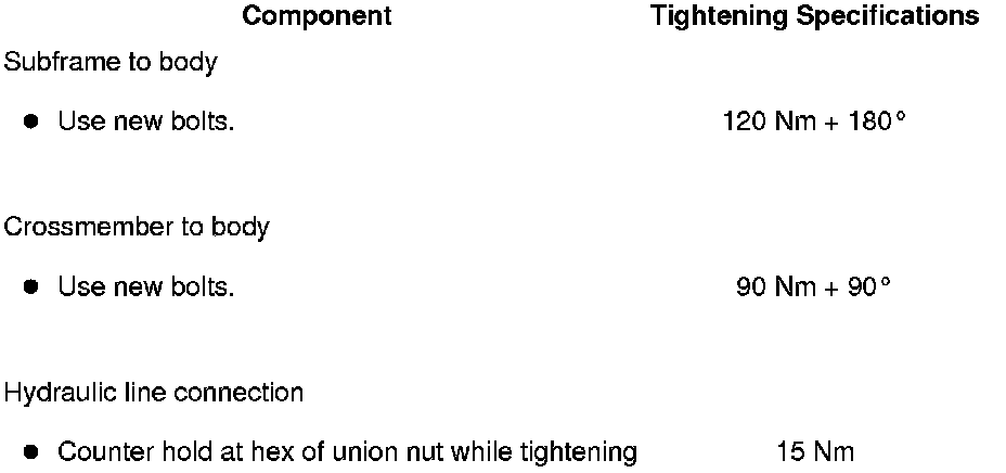 - Tighten subframe using the old bolts. They have to be replaced with new bolts following wheel alignment.
