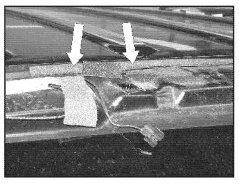 ^ Route antenna cable as shown (top down view) in rear spoiler outside the channel. Use webbing adhesive tape part number D 437S40A1 to hold down antenna cable.