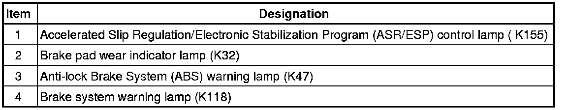 ABS warning lamp (K47), brake system warning lamp (K118) and ASR/ESP control lamp (K155)