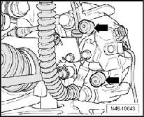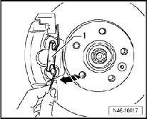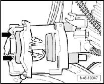 - Remove both guide pins - arrows - from brake caliper.