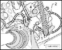 - Remove lower connector - 3 - of brake wear indicator and wheel speed sensor - 4 - from retainer on brake caliper.