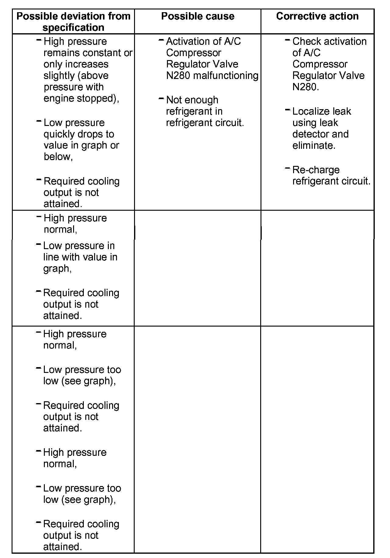 - For the malfunction "high pressure normal, low pressure too low", note the following: If malfunctioning, evaporator may ice-up or cooling output is not reached.