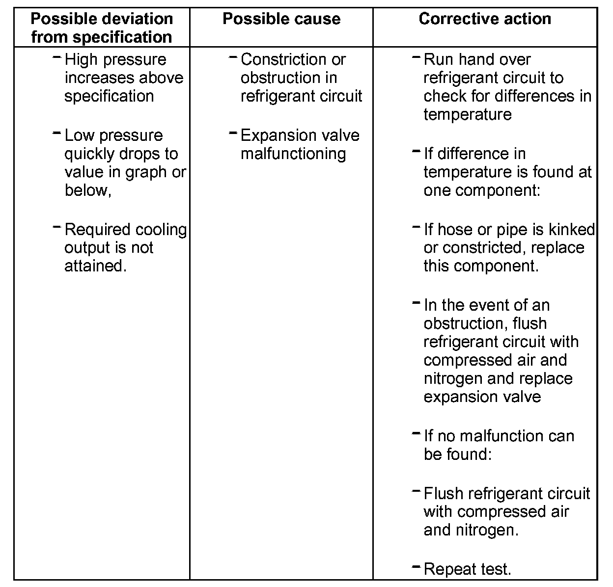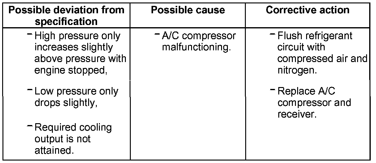 - If the function of the air conditioning system is not OK when the test is repeated, reinstall old expansion valve and flush refrigerant circuit with compressed air and nitrogen. Then replace A/C compressor and receiver.
