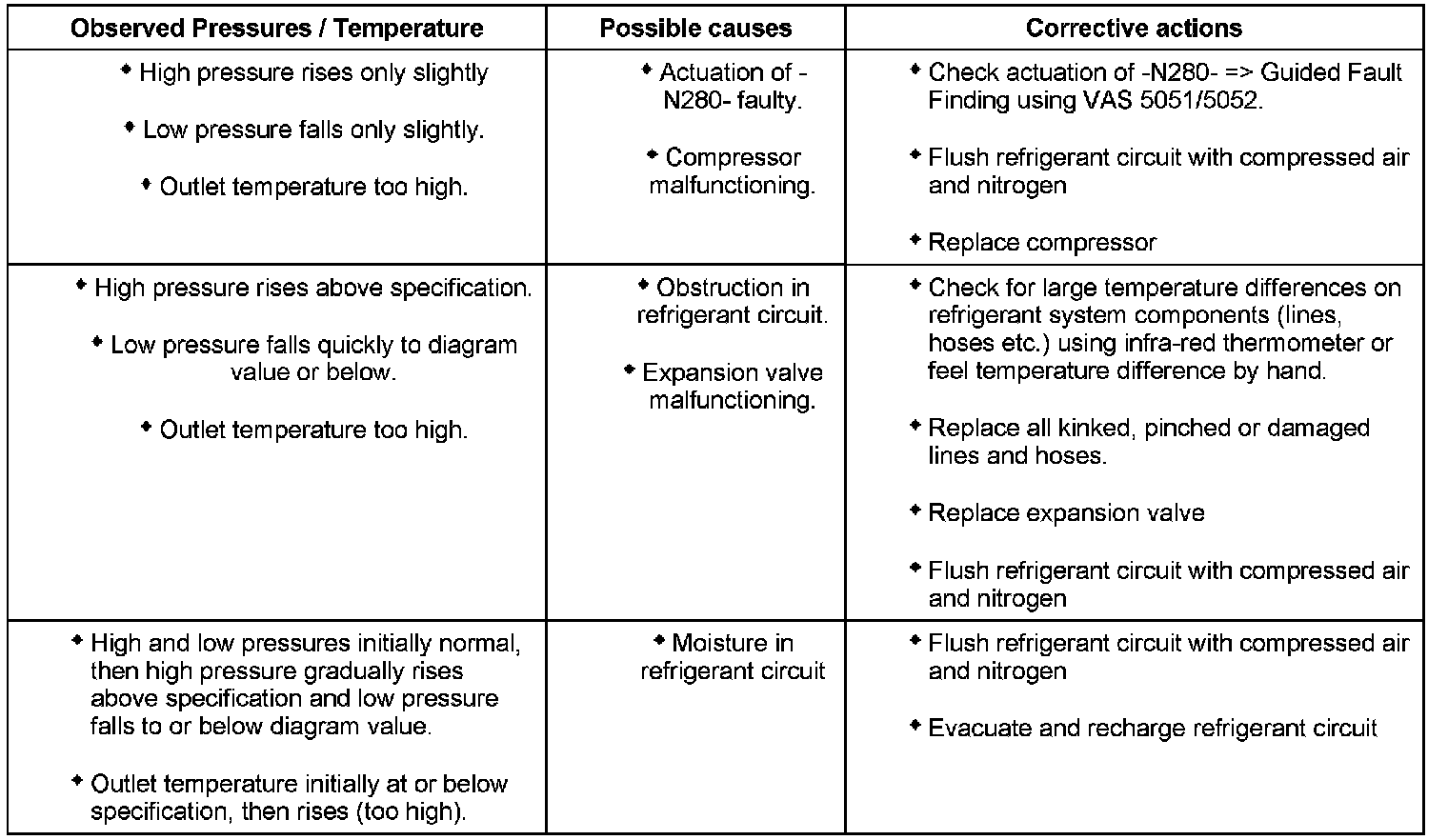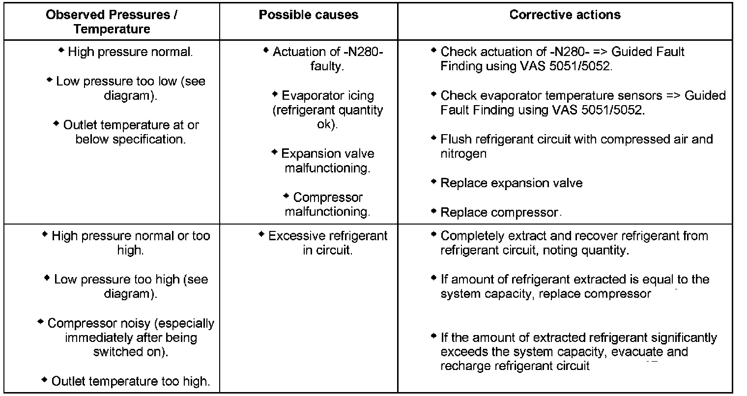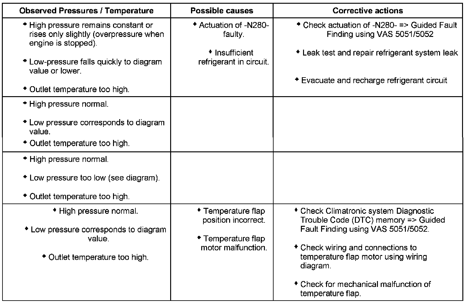 - No Diagnostic Trouble Codes (DTCs) and no A/C compressor shut-off conditions stored/visible in the Climatronic On Board Diagnostic system. Check with VAS 5051/5052 tester in operating mode "Guided Fault Finding".