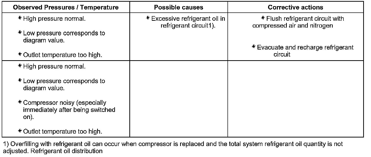 1. Overfilling with refrigerant oil can occur when compressor is replaced and the total system refrigerant oil quantity is not adjusted. Refrigerant oil distribution.