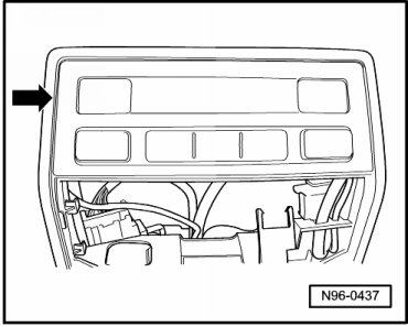 - Carefully pry button module for interior reading lamp out of console in molded headliner - arrow -.