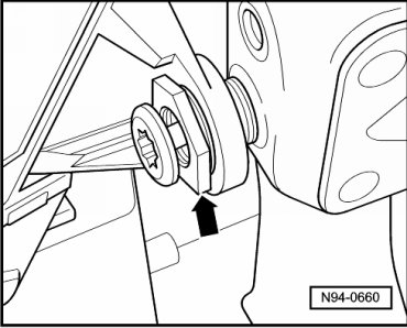 - Loosen the two front mounting bolts - arrows - far enough until headlamp mount with headlamp can be moved back and forth lightly in adjustment bushings.