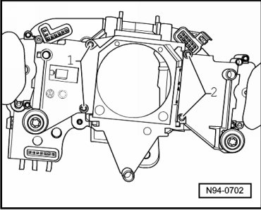 - Release locking mechanism - arrows - at bridge of left Steering Wheel Tiptronic Switch (E389) and remove the complete Steering Wheel Tiptronic Switch (E389).