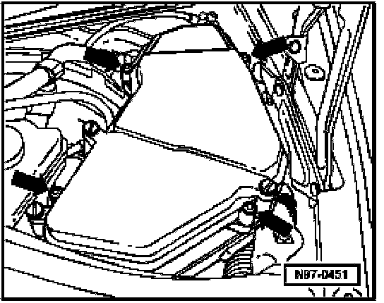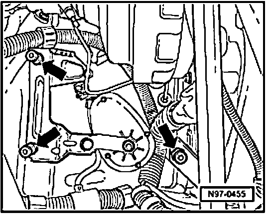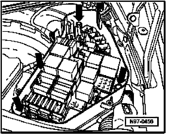 - Clip lower section of E-Box with securing rubbers on pins - arrows - on vehicle.