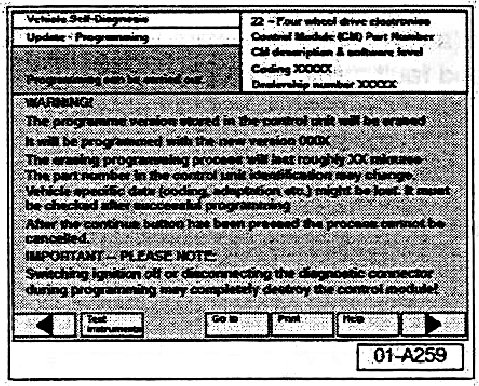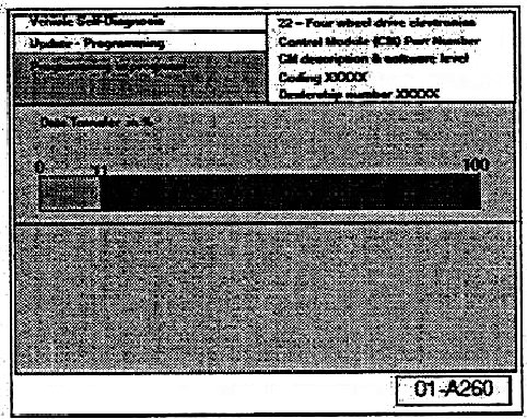 NOTE: Non-observance of the following points may lead to Differential Control Module failure. VAS 5051 or 5052 must always be connected to the approved power supply at the approved voltages. Under no circumstances should the power supply be interrupted or the diagnostic connector unplugged during the flash procedure. Any appliances with high electromagnetic radiation (i.e. mobile phones) must be switched OFF.