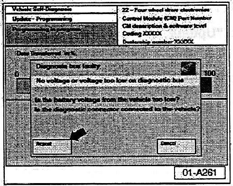 - Confirm that VAS 5051, VAS 5051 B, or VAS 5052 diagnostic tool power supply is adequate and that ALL appliances with high electromagnetic radiation (i.e. mobile phones) are switched OFF.